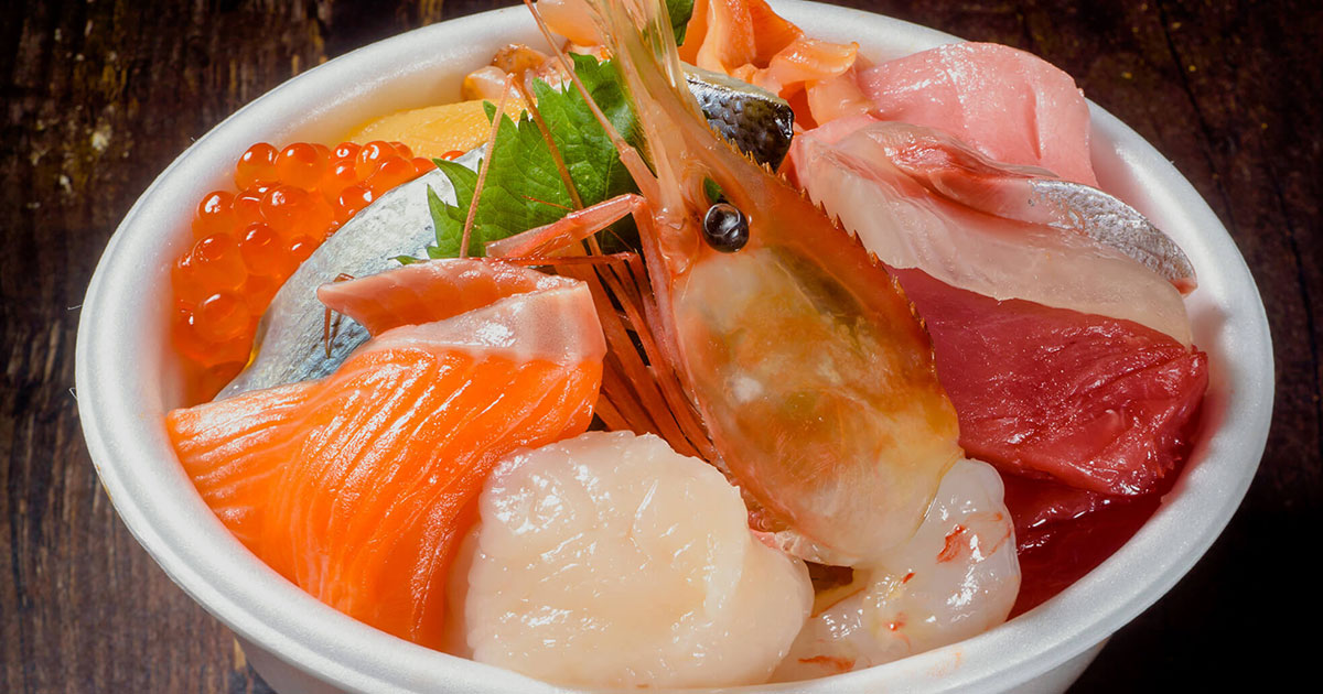 好きな具材を食事券と交換しながらご飯にのせてオリジナルの海鮮丼を作れる